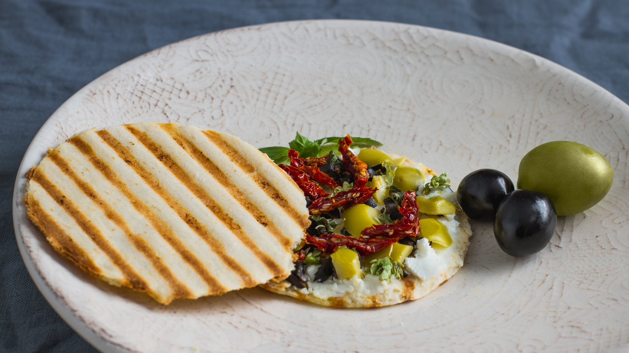 Step 1: Chop the olives.Step 2: Open the pita bread and toast it until golden brown.