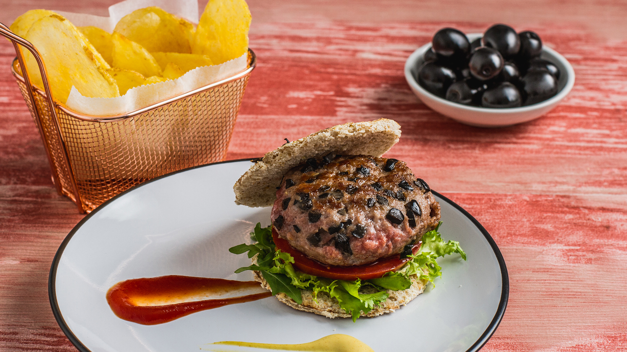 Prepare this hamburger with Hojiblanca olives, beef, tomato, lettuce and burger bread… Simply amazing!